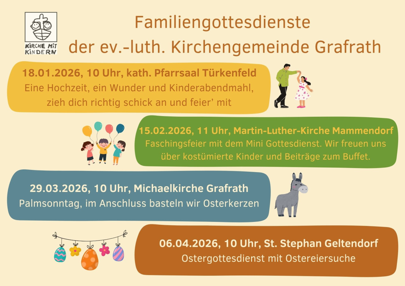 Alle zwei Monate feiern wir in der Martin-Luther-Kirche in Mammendorf Mini Gottesdienst mit Brunch. Dieser Gottesdienst richtet sich speziell an die Kleinsten unserer Gemeinde, vor allem Kinder bis zum Grundschulalter. Wir feiern nach einer immer gleichen Liturgie, sodass schnell Vertrautheit und Gewohnheit aufkommen kann. Im Anschluss bleiben wir zusammen, essen und spielen gemeinsam. Jede:r darf einen Beitrag zum Buffet mitbringen. In einer privaten What's App Gruppe laden wir immer nochmal ein, wer da gerne dabei sein möchte, schreibt eine kurze Email mit Handynummer ans Pfarramt oder an Pfarrerin Röhm.